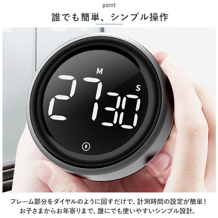 ・フレーム部分をダイヤルのように回すだけで、計測時間の設定が簡単!お子さまからお年寄りまで、誰にでも使いやすいシンプル設計。