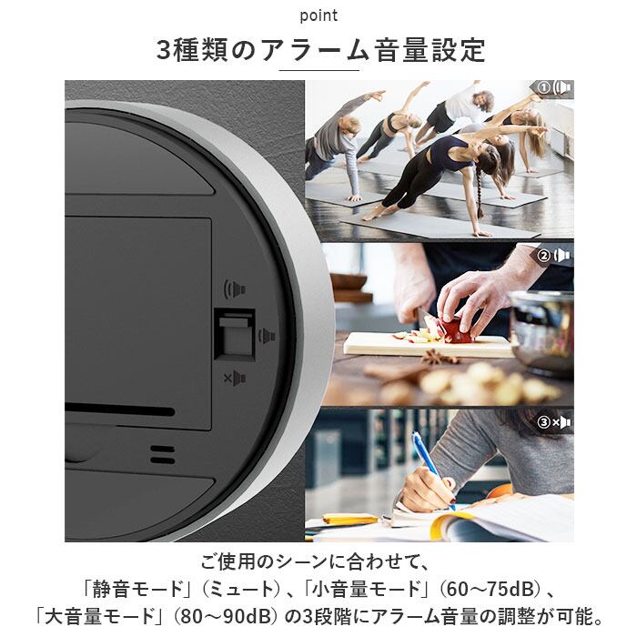 ・ご使用のシーンに合わせて、「静音モード」(ミュート)、「小音量モード」(60~75dB)、「大音量モード」(80~90dB)の3段階にアラーム音量の調整が可能。