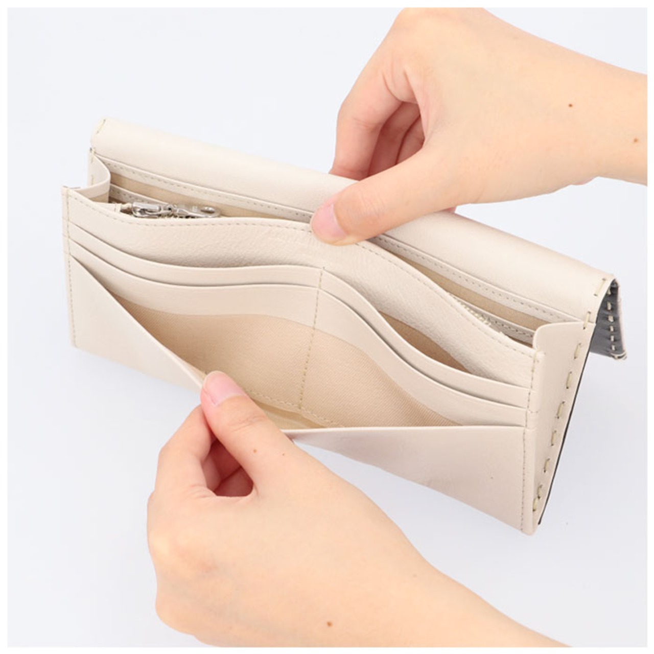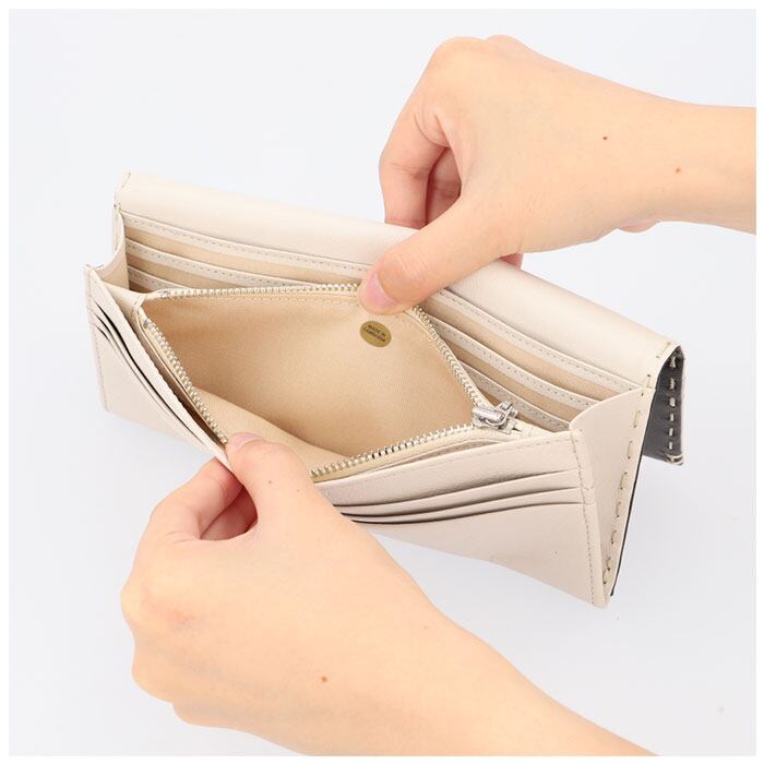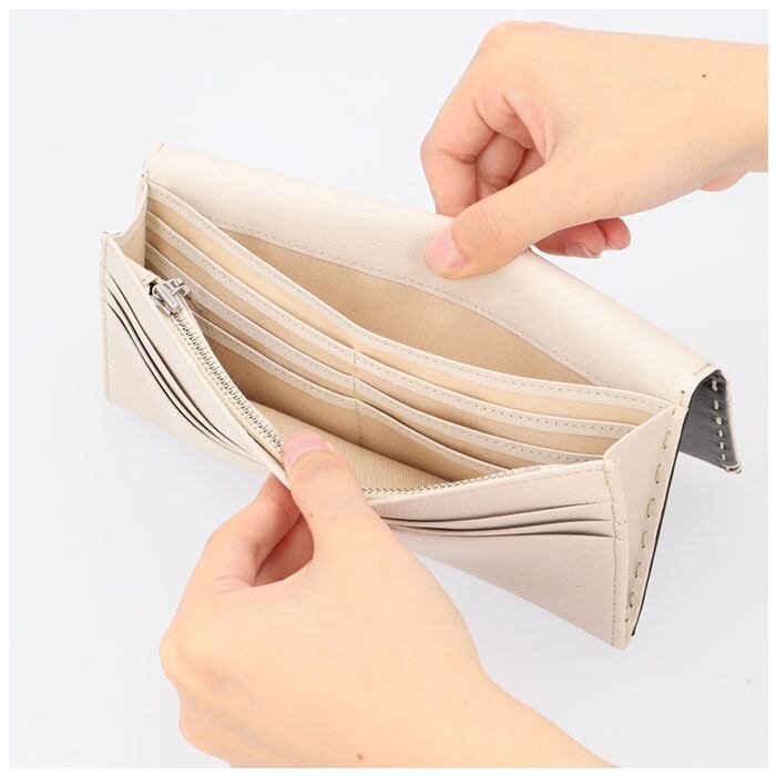 ・薄マチながらカードポケット×14、フリーポケット×3、札入れ×2、小銭入れ×1と収納力に長けたかぶせ型の長財布。必要な物はしっかり収納。