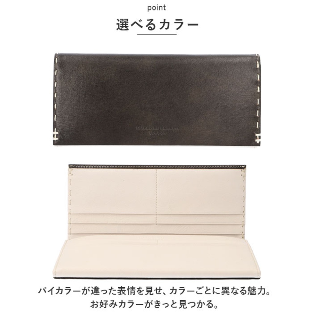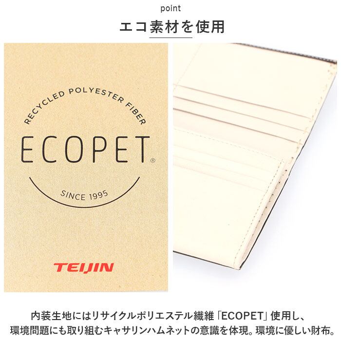 ・内装生地にはリサイクルポリエステル繊維「ECOPET」使用し、環境問題にも取り組むキャサリンハムネットの意識を体現。環境に優しい財布。