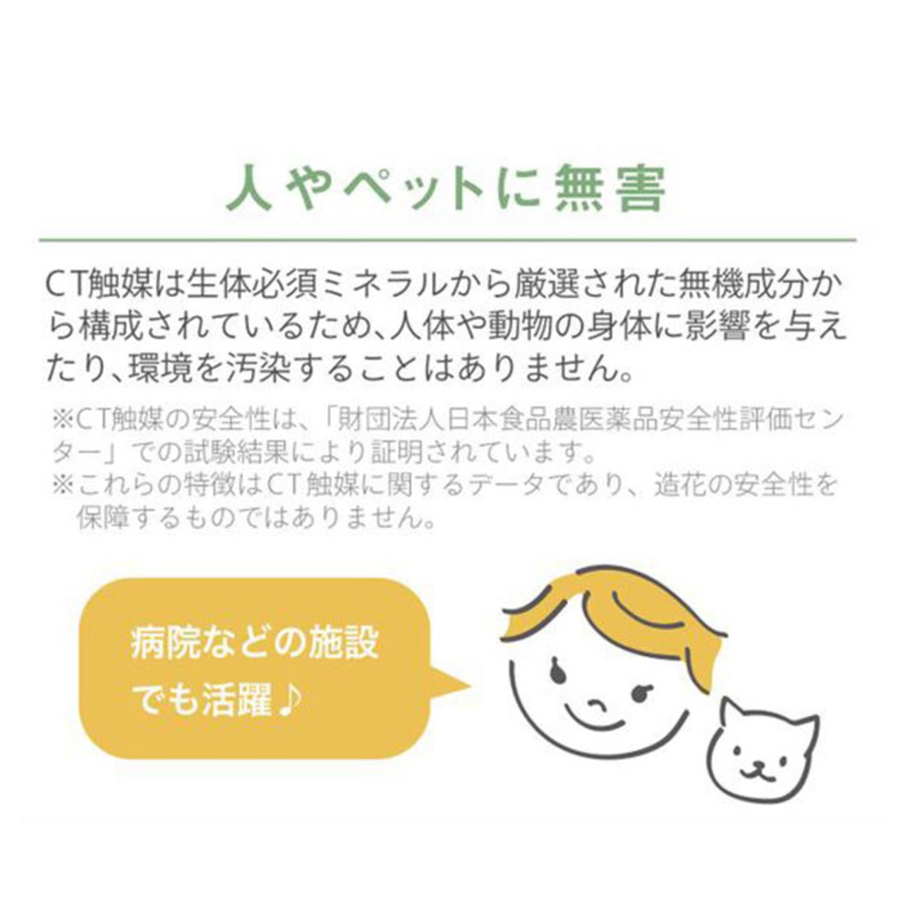 「CT触媒」とは、生体必須ミネラルに含まれる元素から厳選したミネラル複合体のこと。非常に安全性が高く、人体にも無害なので、小さなお子さまやペットのいるご家庭でも安心。