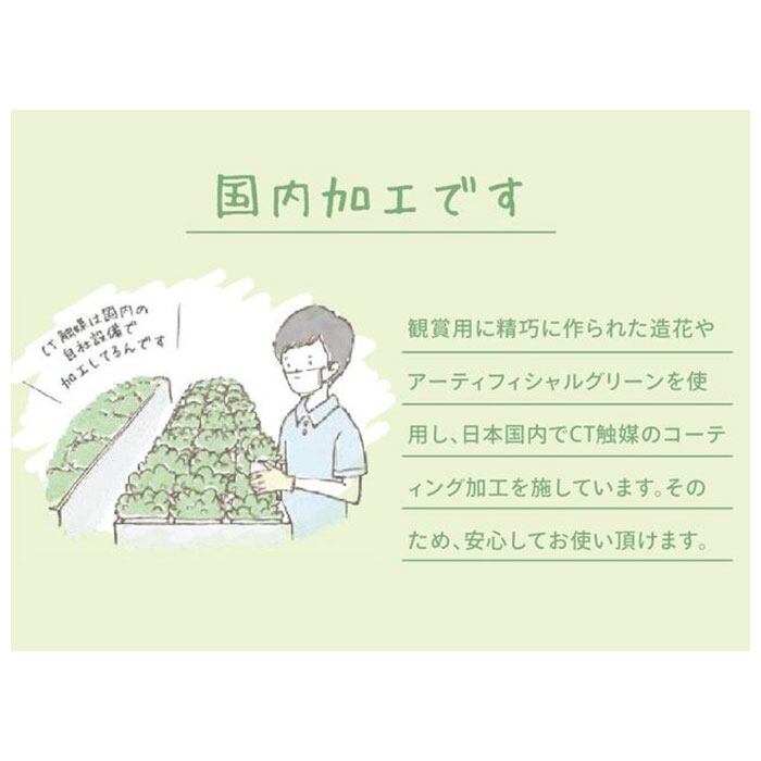 ※葉の表面にホコリがたまりすぎると、CT触媒が空気に触れにくくなり効果が弱まりますので、ホコリがたまった場合は葉の表面をはたきや柔らかく乾いた布などで優しく払いとってください。強くこすりすぎると、CT触媒コーティングが剥がれて効果が損なわれる恐れがありますのでご注意ください。