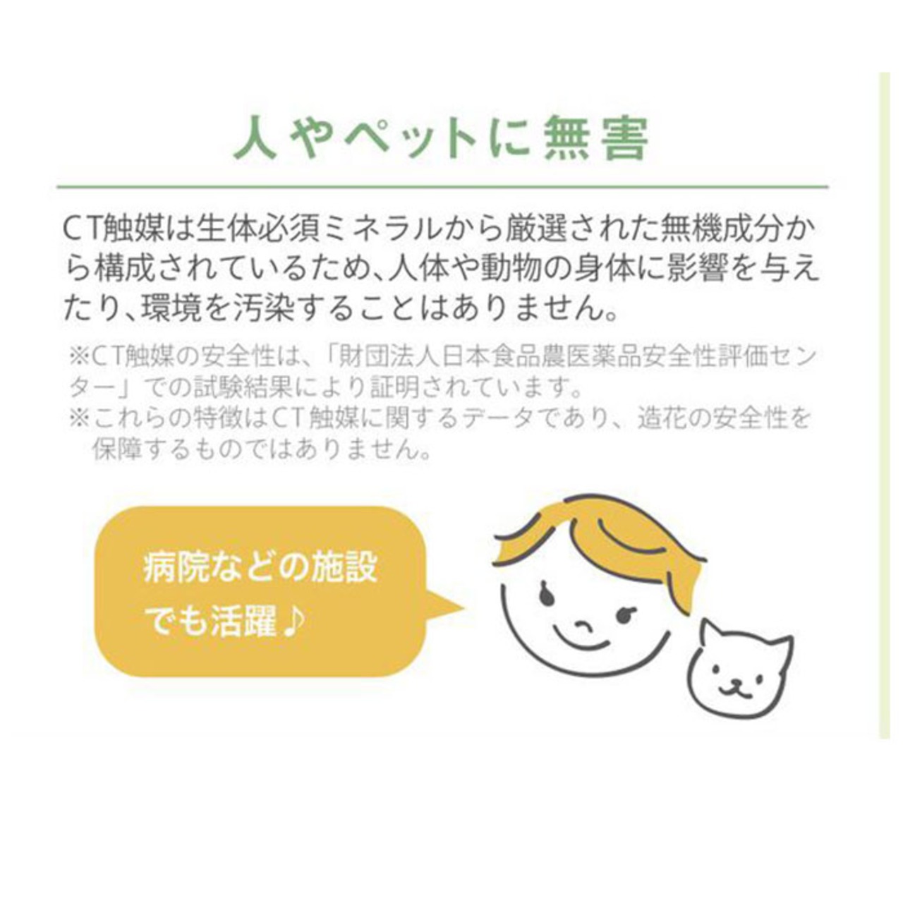 ・「CT触媒」とは、生体必須ミネラルに含まれる元素から厳選したミネラル複合体。安全性が高く人体にも無害なので、小さなお子様やペットのいるご家庭でも安心◎