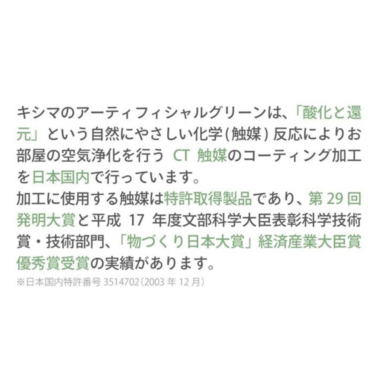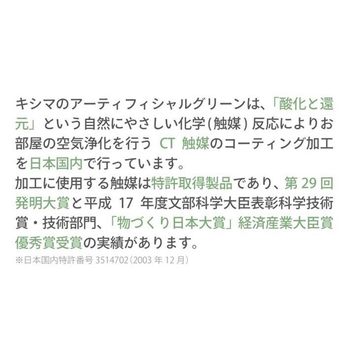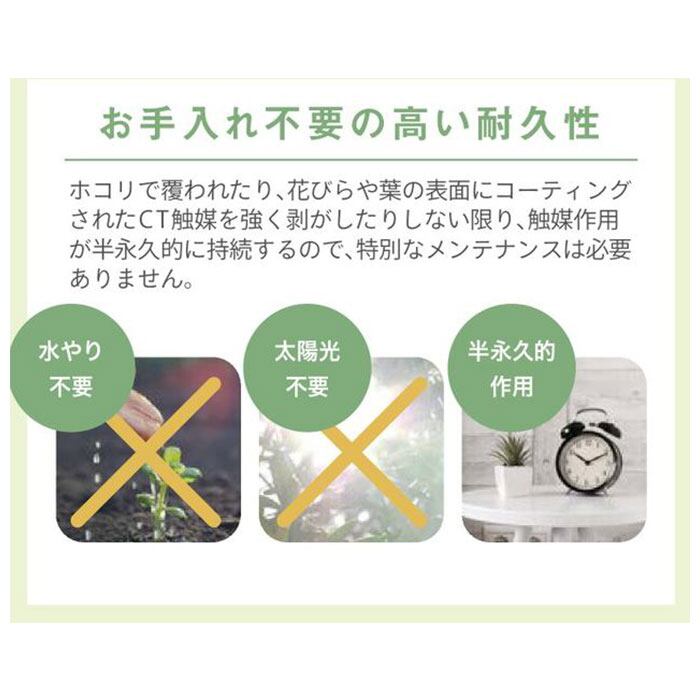 ※葉の表面にホコリがたまりすぎると、CT触媒が空気に触れにくくなり効果が弱まりますので、ホコリがたまった場合は葉の表面をはたきや柔らかく乾いた布などで優しく払いとってください。強くこすりすぎると、CT触媒コーティングが剥がれて効果が損なわれる恐れがありますのでご注意ください。