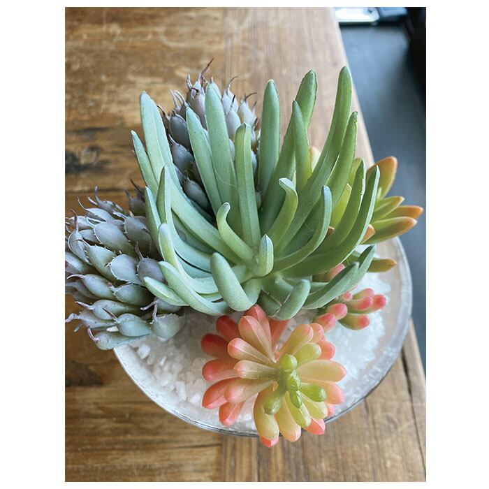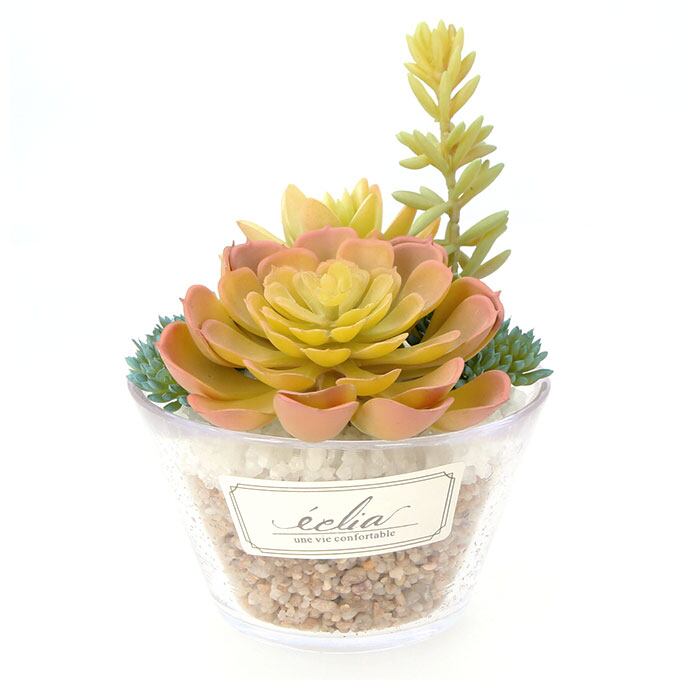 ・まるで本物のような繊細なタッチでつくられたパステルカラーの多肉植物を、お洒落なガラス容器に可愛く寄せ植え。