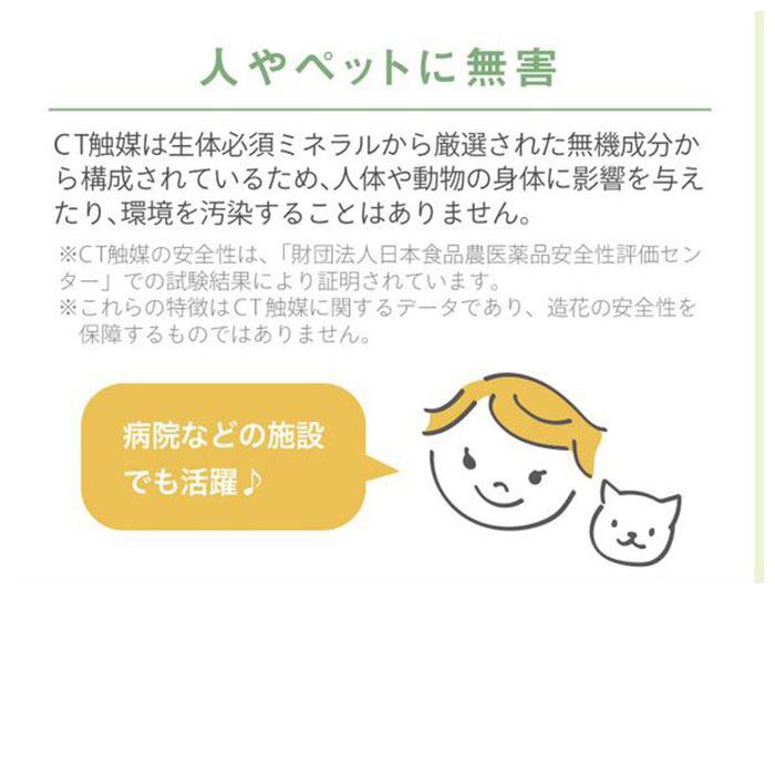 「CT触媒」とは、生体必須ミネラルに含まれる元素から厳選したミネラル複合体のこと。非常に安全性が高く、人体にも無害なので、小さなお子さまやペットのいるご家庭でも安心。