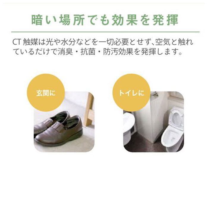 ・CT触媒は、ホコリに埋もれない限り半永久的に効果を発揮!光のない暗い場所でも効果が続くため、お手洗いや玄関にも置いてもOK!