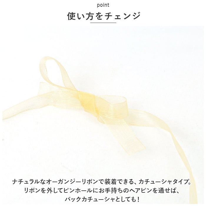 ・ナチュラルなオーガンジーリボンで装着できる、カチューシャタイプ。リボンを外してピンホールにお手持ちのヘアピンを通せば、バックカチューシャとしても!