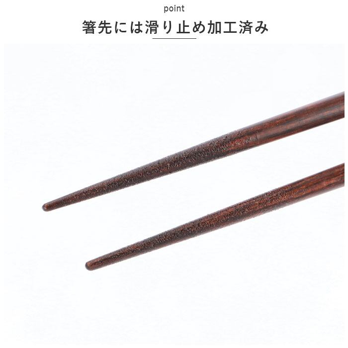 ・福井県小浜市で生産される、伝統工芸品の漆器「若狭塗」の技法を用いて作られたお箸。天然木にポリエステルウレタン塗装を施しており、家庭用食洗機の使用OK!箸先には滑り止め加工済み。