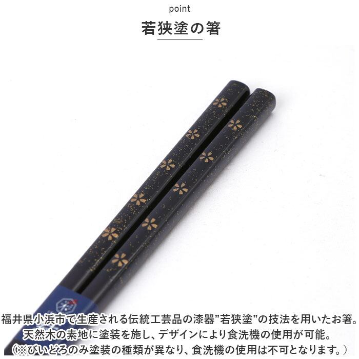 ・福井県小浜市で生産される、伝統工芸品の漆器”若狭塗”の技法を用いたお箸。天然木の素地に塗装を施し、デザインにより食洗機の使用が可能。(※びいどろのみ塗装の種類が異なり、食洗機の使用は不可となります。)