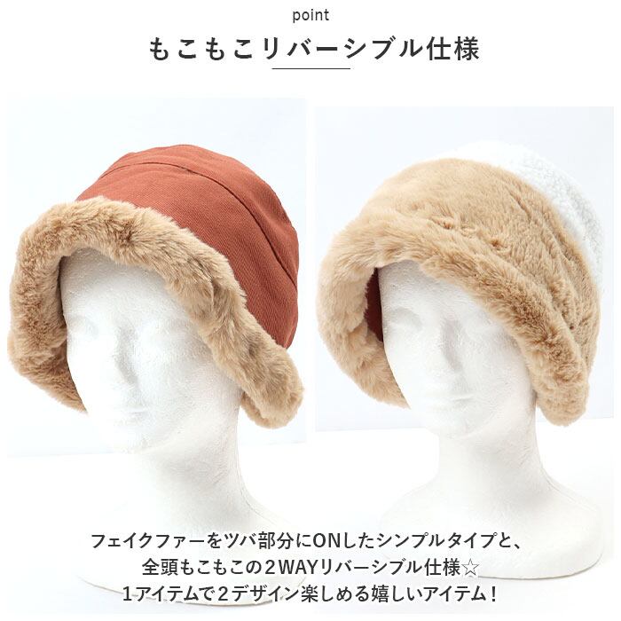 ・フェイクファーをツバ部分にONしたシンプルタイプと、全頭もこもこの2WAYリバーシブル仕様☆1アイテムで2デザイン楽しめる嬉しいアイテム!