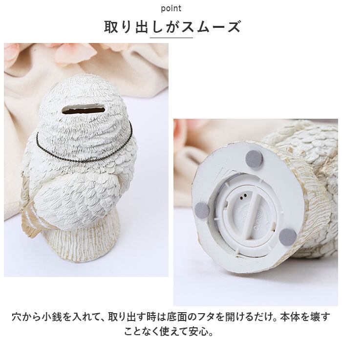 ・穴から小銭を入れて、取り出す時は底面のフタを開けるだけ。本体を壊すことなく使えて安心。