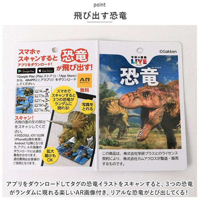 ・アプリをダウンロードしてタグの恐竜イラストをスキャンすると、3つの恐竜がランダムに現れる楽しいAR画像付き。リアルな恐竜がとび出してくる!