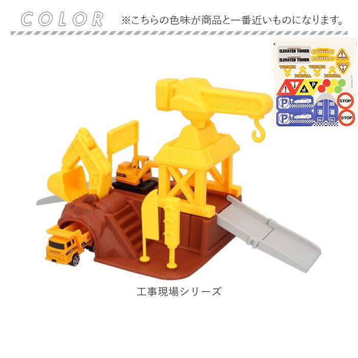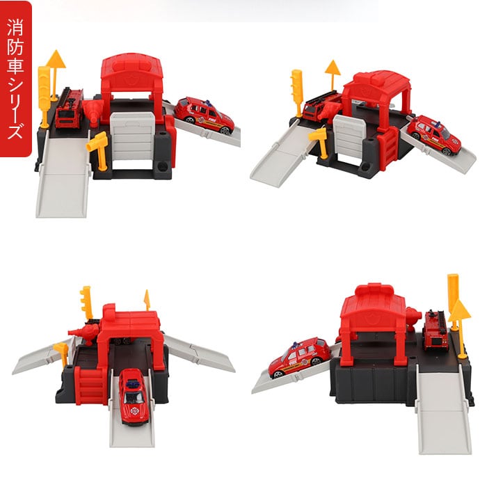 ・楽しいギミック機能を搭載した、組み立て式のカーステーションにダイキャストカー(ミニカー)2台と、街並みがプリントされたプレイマットがセットに。