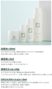 ・化粧水…30ml。みどりまゆエキスの他、整肌作用を持つダマスクバラ花油を配合。お肌に潤いを与え、健やかな状態へと導く。