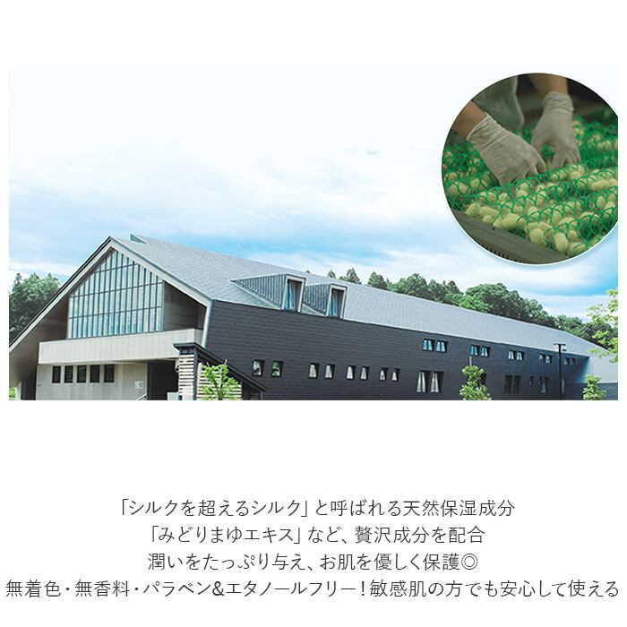 「シルクを超えるシルク」と呼ばれる天然保湿成分「みどりまゆエキス」など、贅沢成分を配合。潤いをたっぷり与え、お肌を優しく保護◎