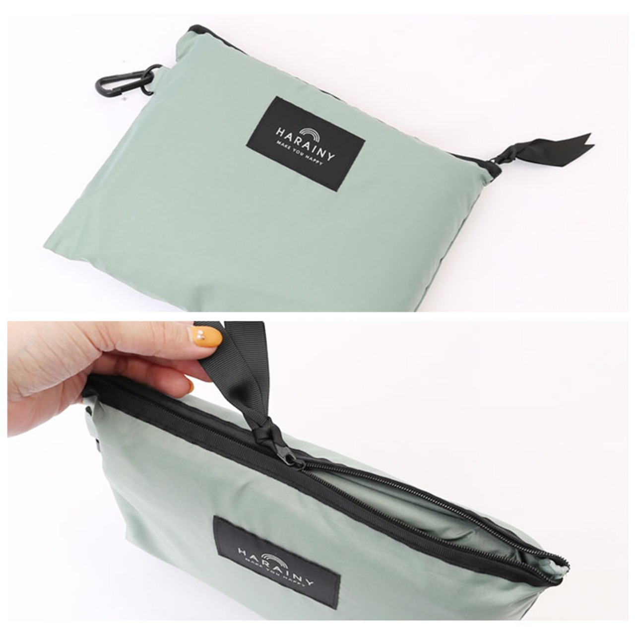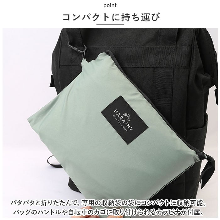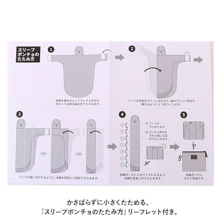 ・パタパタと折りたたんで、専用の収納袋の袋にコンパクトに収納可能。バッグのハンドルや自転車のカゴに取り付けられるカラビナが付属。(※かさばらずに小さくたためる、「スリーブポンチョのたたみ方」リーフレット付き。)