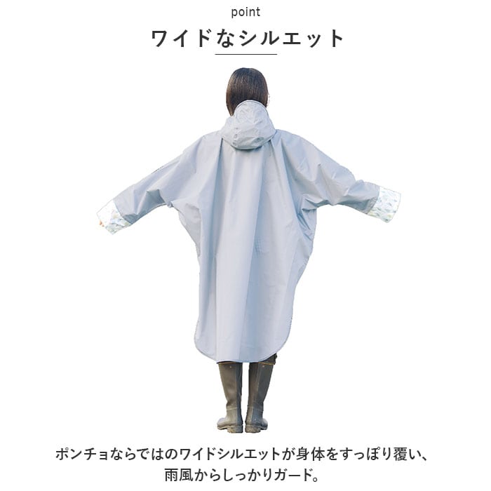 ・ポンチョならではのワイドシルエットが身体をすっぽり覆い、雨風からしっかりガード。