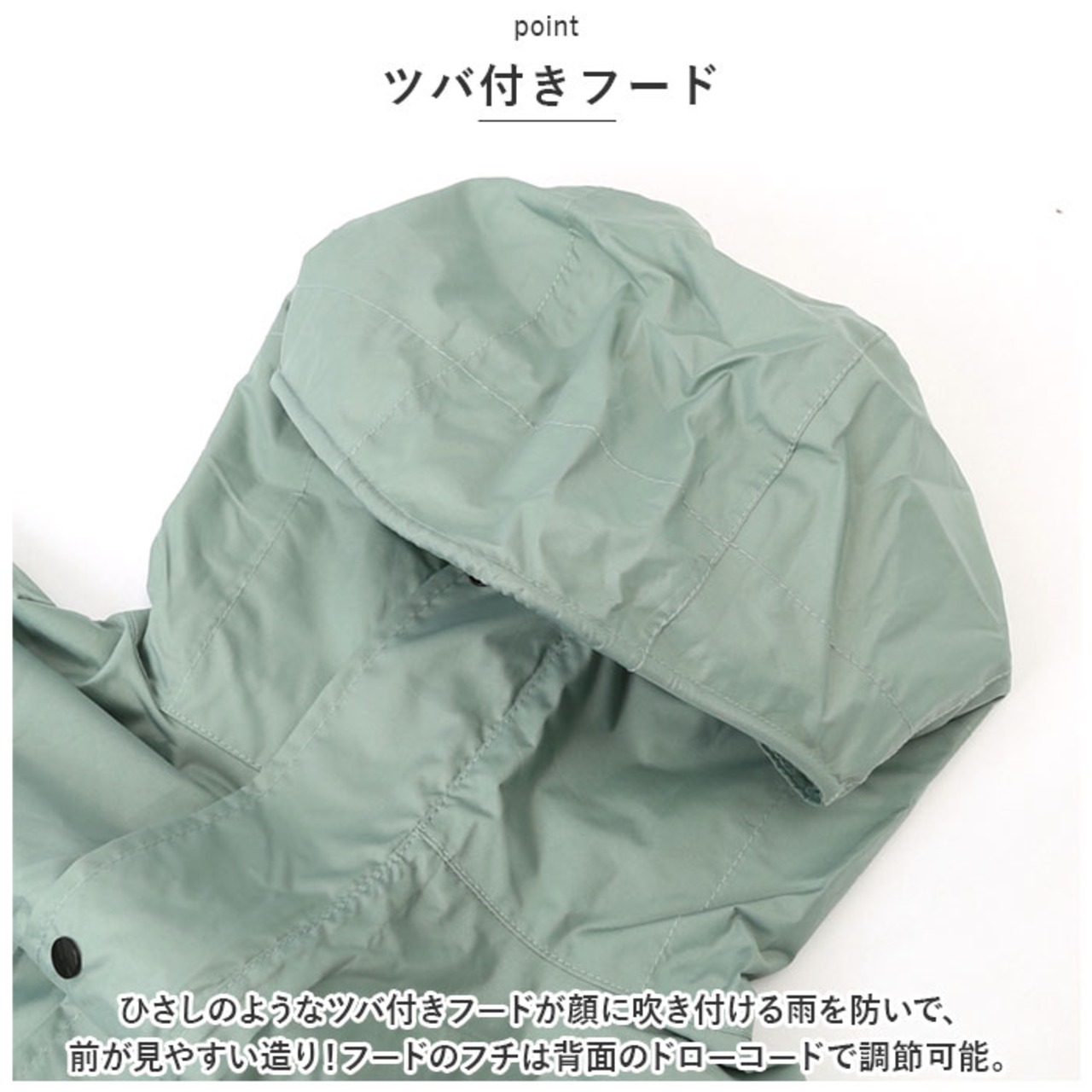 ・ひさしようなツバ付きフードが顔に吹き付ける雨を防いで、前が見やすい造り!フードのフチは背面のドローコードで調節可能。