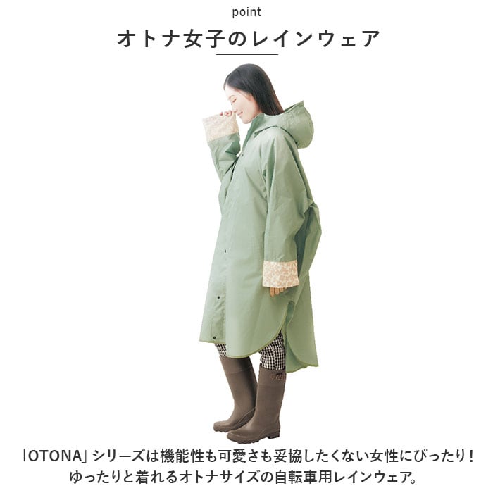 ・「OTONA」シリーズは、機能性も可愛さも妥協したくない女性にぴったり!ゆったりと着れるオトナサイズの自転車用レインウェア。