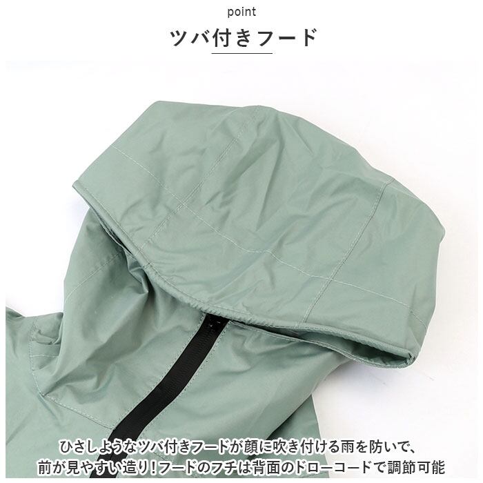 ・ひさしようなツバ付きフードが顔に吹き付ける雨を防いで、前が見やすい造り!フードのフチは背面のドローコードで調節可能。