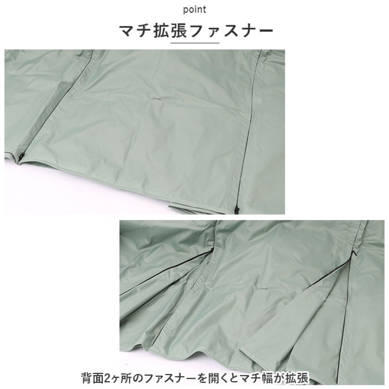 ・背面2ヶ所のファスナーを開くとマチ幅が拡張。バックパックを背負ったままでもゆったりと着用できるのが嬉しいポイント。