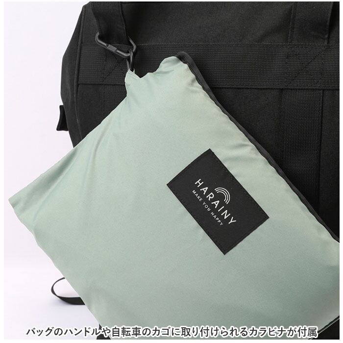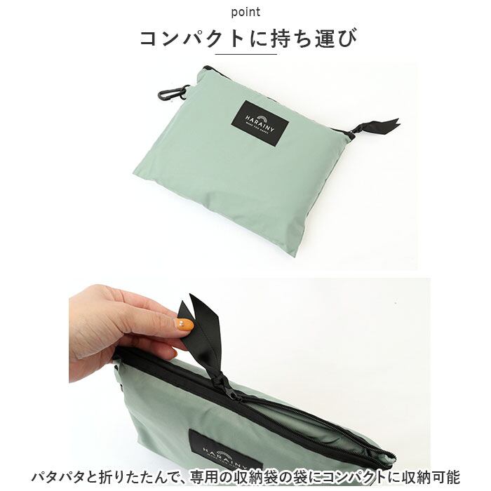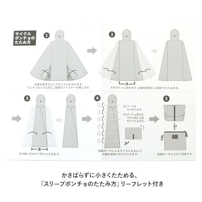 ・パタパタと折りたたんで、専用の収納袋の袋にコンパクトに収納可能。バッグのハンドルや自転車のカゴに取り付けられるカラビナが付属。(※かさばらずに小さくたためる、「スリーブポンチョのたたみ方」リーフレット付き。)