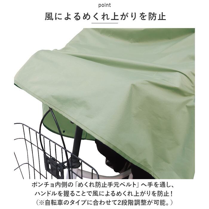 ・ポンチョ内側の「めくれ防止手元ベルト」へ手を通し、ハンドルを握ることで風によるめくれ上がりを防止!(※自転車のタイプに合わせて2段階調整が可能。)