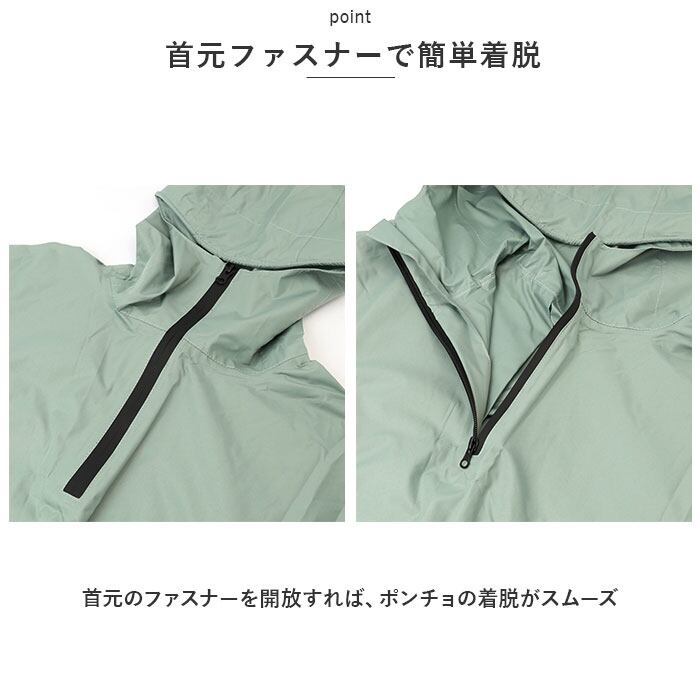 ・首元のファスナーを開放すれば、ポンチョの着脱がスムーズ。忙しい朝の通勤前や、お子さまの送り迎え前にサッと羽織れる♪