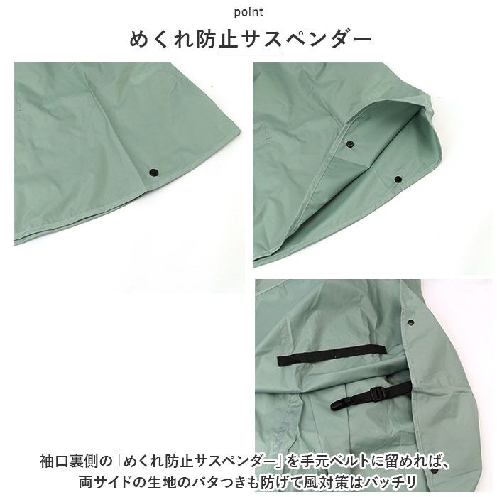 ・袖口裏側の「めくれ防止サスペンダー」を手元ベルトに留めれば、両サイドの生地のバタつきも防げて風対策はバッチリ。