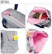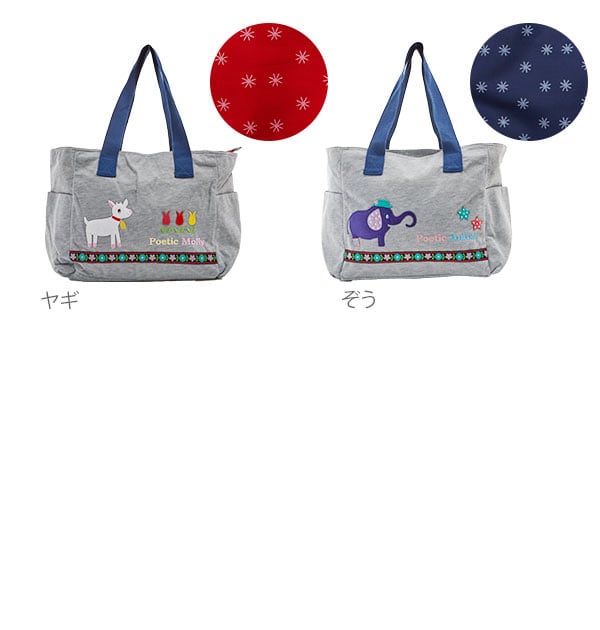 スウェット生地にアップリケと刺繍を使って、やさしい風合いのママバッグです。両サイドポケットは500mlペットボトルが入ります。