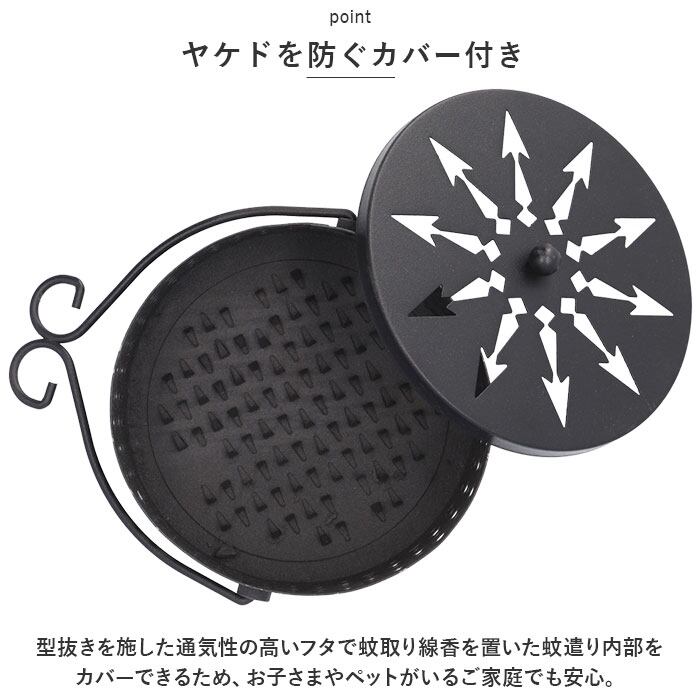 ・型抜きを施した通気性の高いフタで蚊取り線香を置いた蚊遣り内部をカバーできるため、お子さまやペットがいるご家庭でも安心。