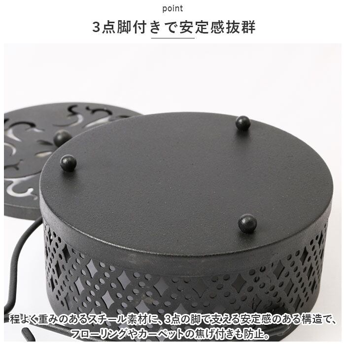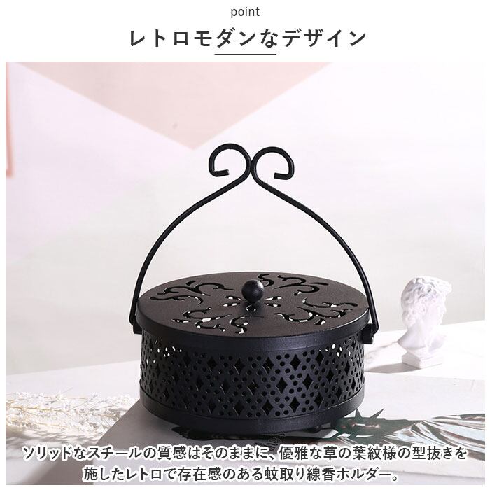 ・ソリッドなスチールの質感はそのままに、優雅な草の葉紋様の型抜きを施したレトロで存在感のある蚊取り線香ホルダー。
