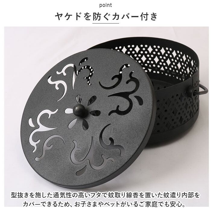 ・型抜きを施した通気性の高いフタで蚊取り線香を置いた蚊遣り内部をカバーできるため、お子さまやペットがいるご家庭でも安心。