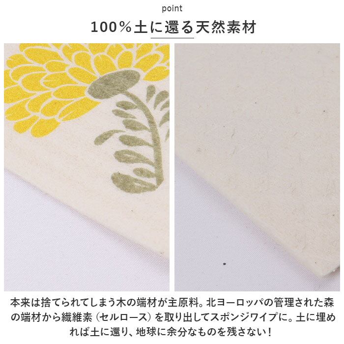 ・本来は捨てられてしまう木の端材が主原料。北ヨーロッパの管理された森の端材から繊維素(セルロース)を取り出してスポンジワイプに。土に埋めれば土に還り、地球に余分なものを残さない!
