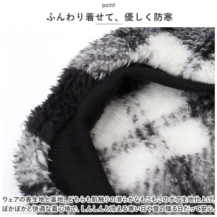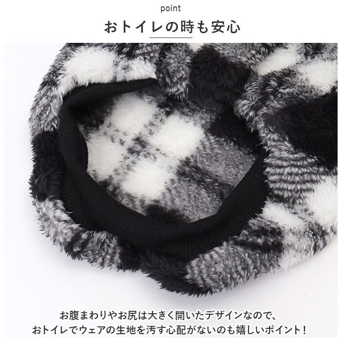 ・ウェアの表生地と裏地、どちらも肌触りの滑らかなもこもこのボア生地仕上げ。ぽかぽかと快適な着心地で、しんしんと冷える寒い日や雪の降る日だって安心。