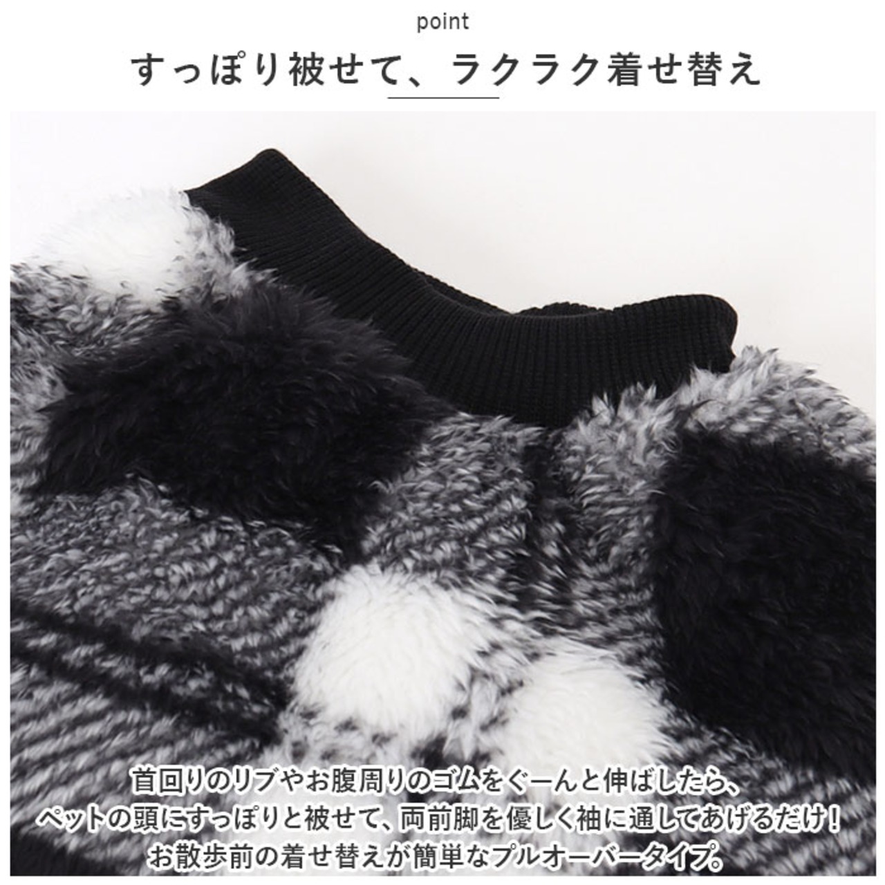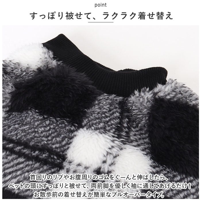 ・首回りのリブやお腹周りのゴムをぐーんと伸ばしたら、ペットの頭にすっぽりと被せて、両前脚を優しく袖に通してあげるだけ!お散歩前の着せ替えが簡単なプルオーバータイプ。