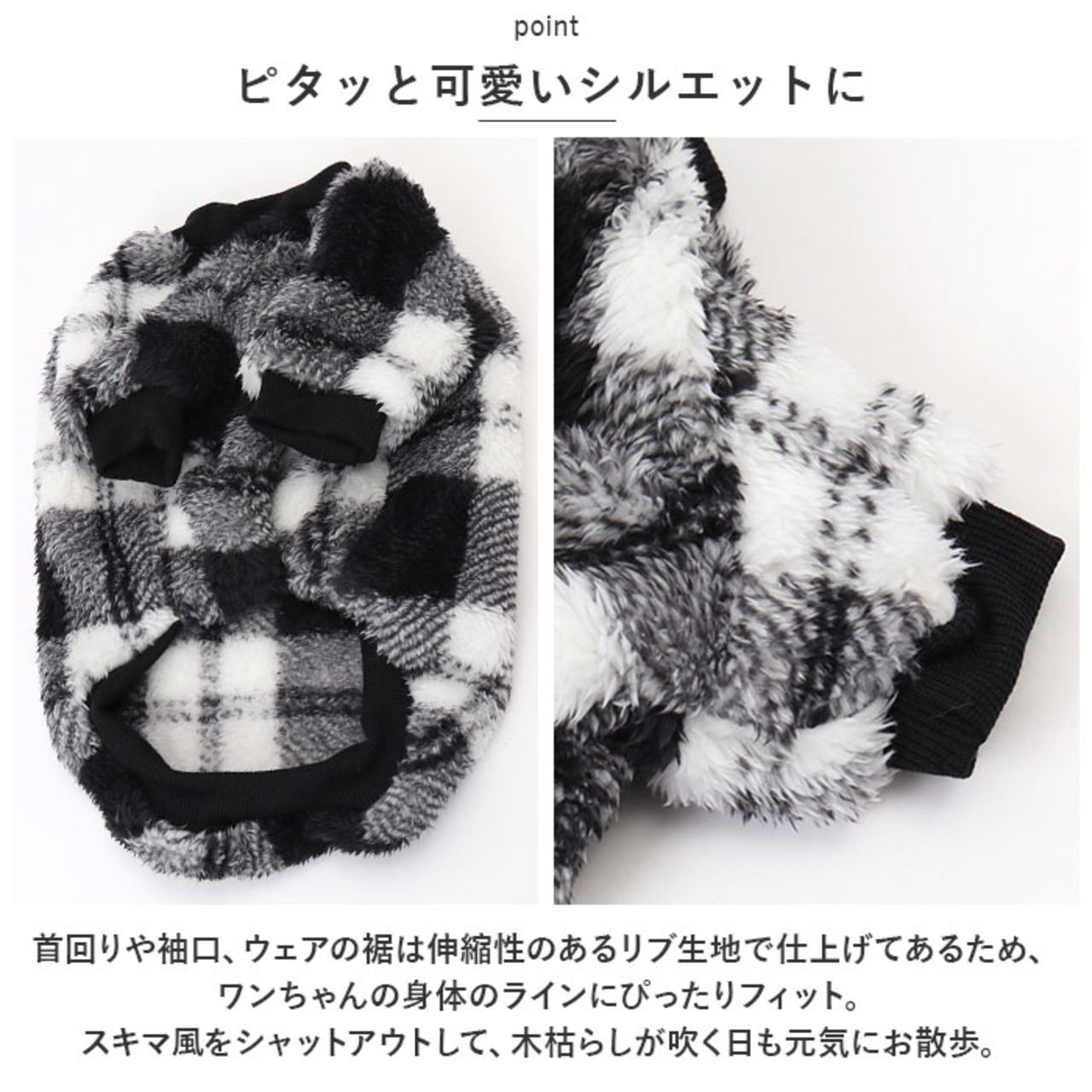 ・首回りや袖口、ウェアの裾は伸縮性のあるリブ生地で仕上げてあるため、ワンちゃんの身体のラインにぴったりフィット。スキマ風をシャットアウトして、木枯らしが吹く日も元気にお散歩。