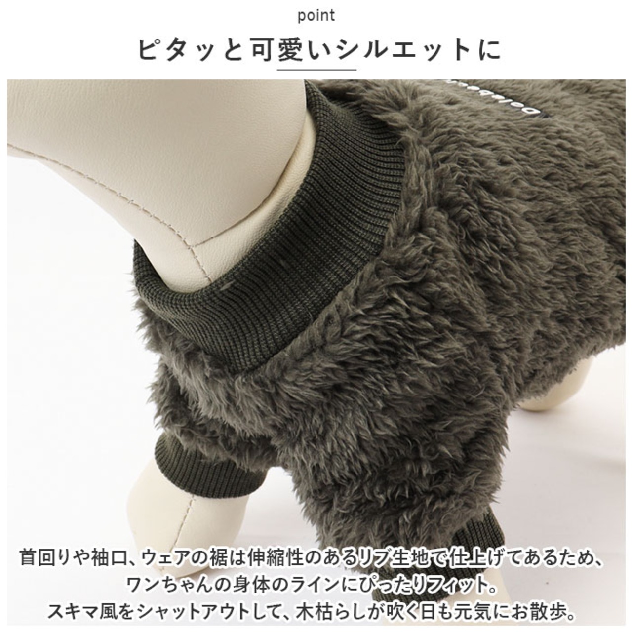 ・首回りや袖口、ウェアの裾は伸縮性のあるリブ生地で仕上げてあるため、ワンちゃんの身体のラインにぴったりフィット。スキマ風をシャットアウトして、木枯らしが吹く日も元気にお散歩。