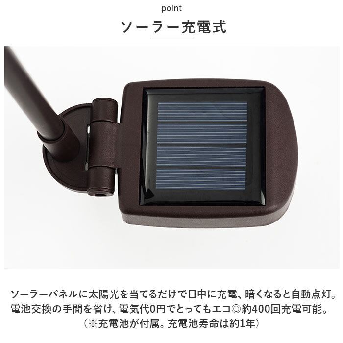 ・ソーラーパネルに太陽光を当てるだけで日中に充電、暗くなると自動点灯。電池交換の手間を省け、電気代0円でとってもエコ◎約400回充電可能。(※充電池が付属。充電池寿命は約1年)