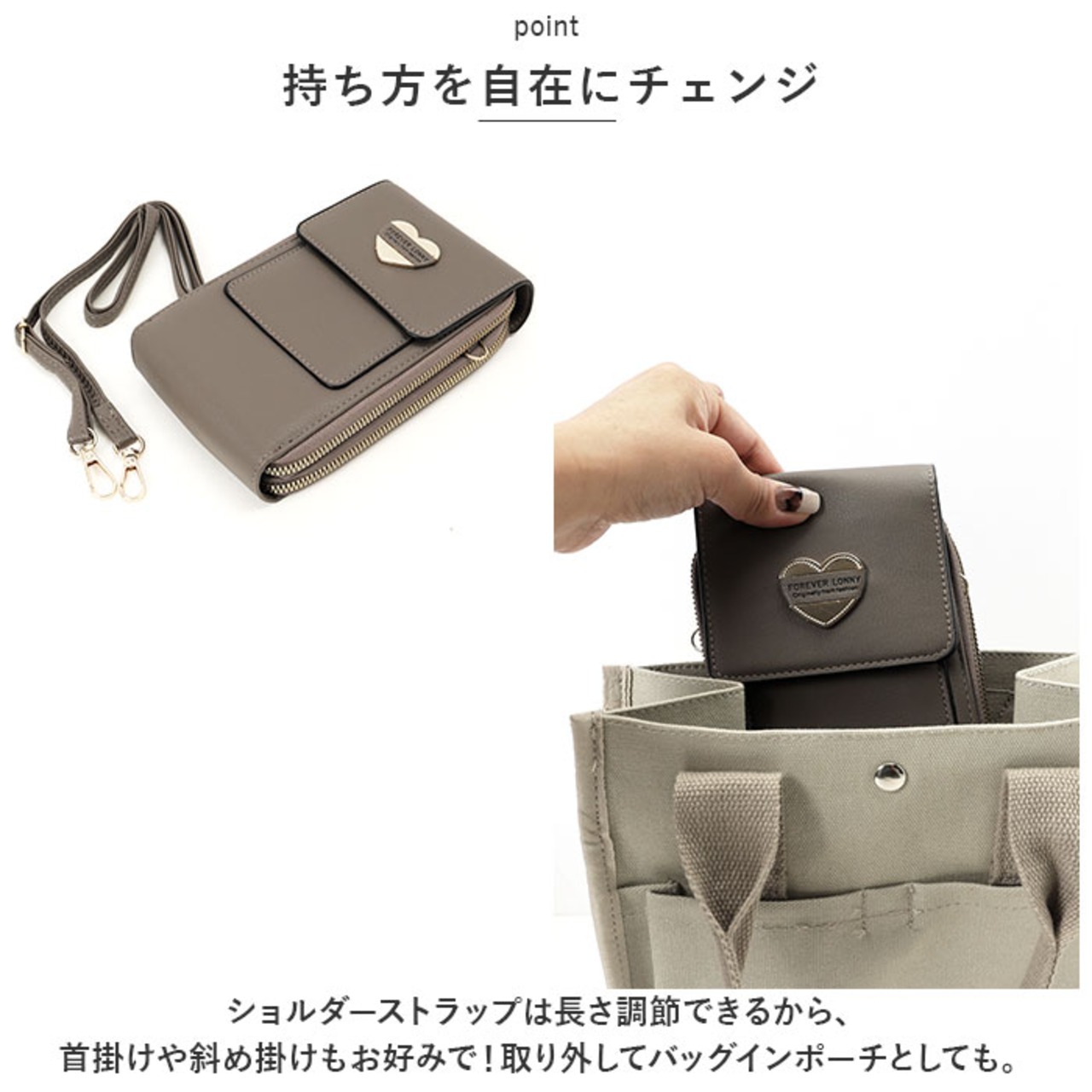 ・ショルダーストラップは長さ調節できるから、首掛けや斜め掛けもお好みで!取り外してバッグインポーチとしても。