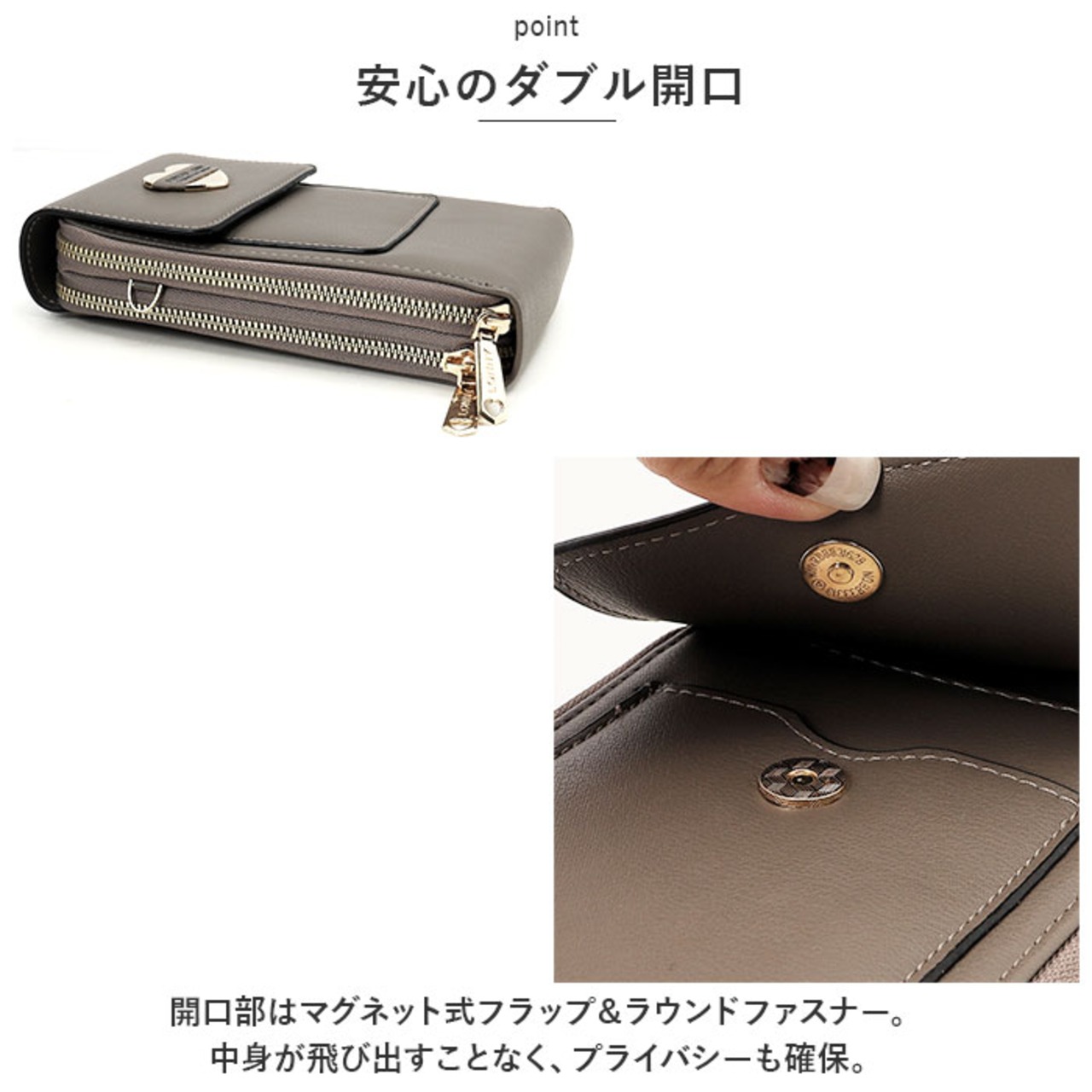 ・開口部はマグネット式フラップ&ラウンドファスナー。中身が飛び出すことなく、プライバシーも確保。