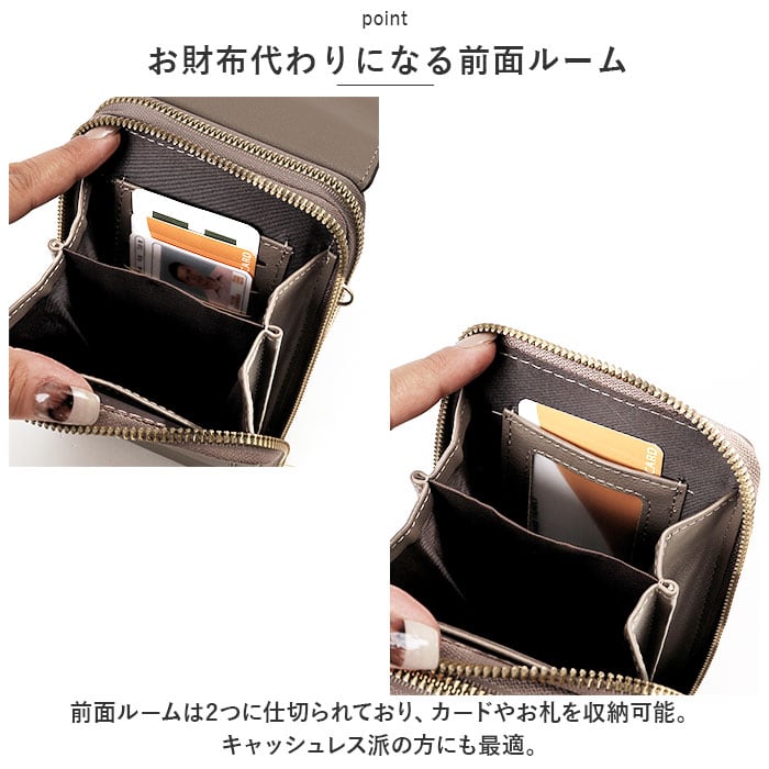 ・前面ルームは2つに仕切られており、カードやお札を収納可能。キャッシュレス派の方にも最適。