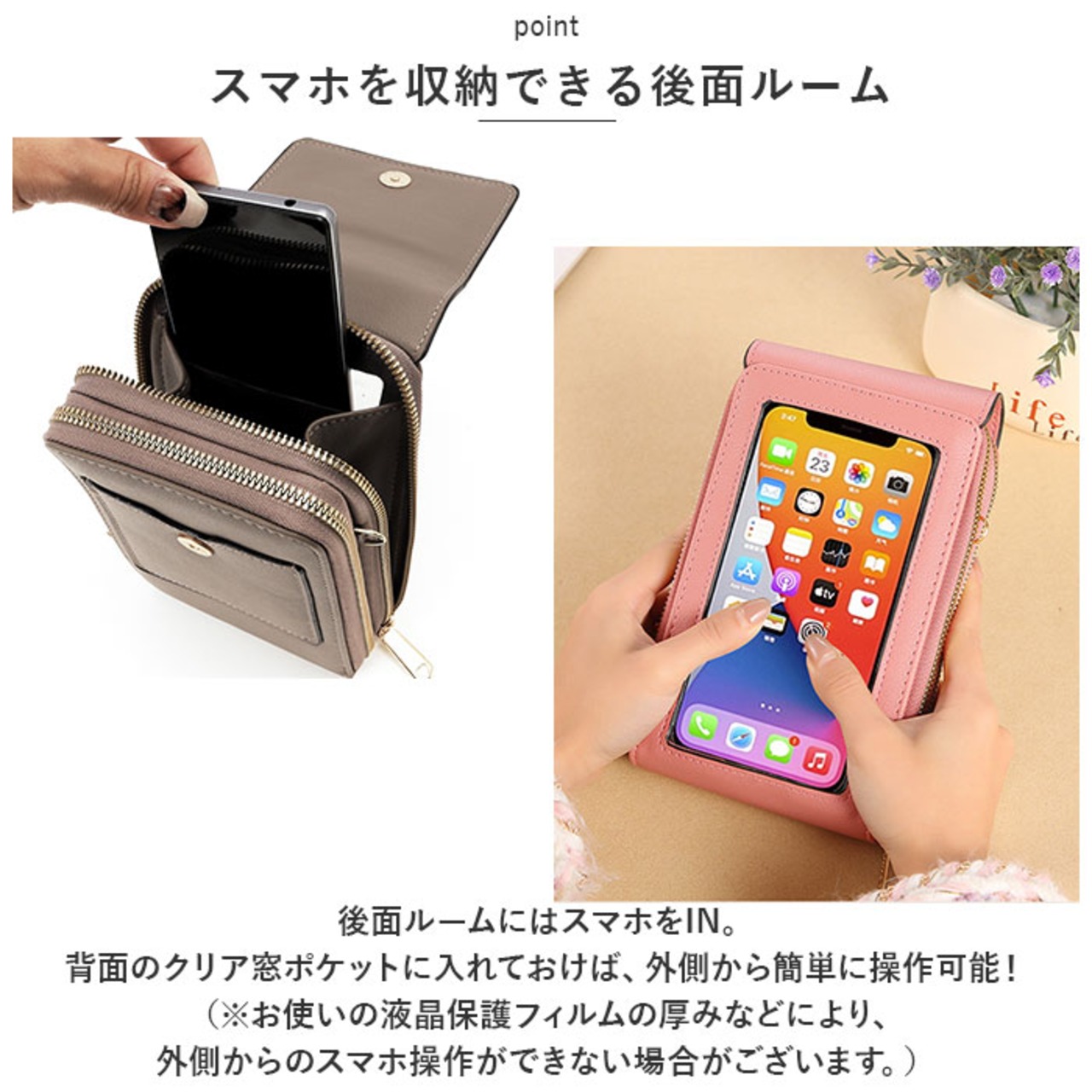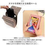 ・後面ルームにはスマホをIN。背面のクリア窓ポケットに入れておけば、外側から簡単に操作できちゃう!(※お使いの液晶保護フィルムの厚みなどにより、外側からのスマホ操作ができない場合がございます。)