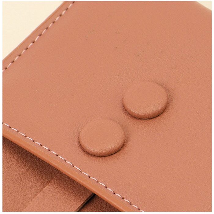 ・表面にはソフトなPUレザー素材を使用し、落ち着きのある仕上がりに。フラップ部分のボタンデザインがアクセント。