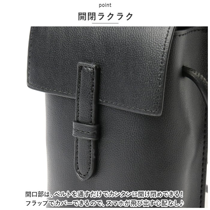 ・開口部は、ベルトを通すだけでカンタンに開け閉めできる!フラップでカバーできるので、スマホが飛び出す心配なし♪