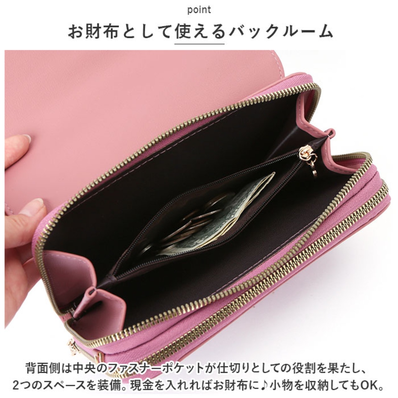 ・背面側は中央のファスナーポケットが仕切りとしての役割を果たし、2つのスペースを装備。現金を入れればお財布に♪小物を収納してもOK。
