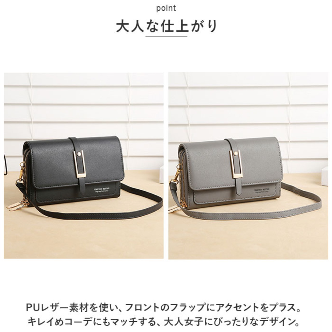 ・PUレザー素材を使い、フロントのフラップにアクセントをプラス。キレイめコーデにもマッチする、大人女子にぴったりなデザイン。