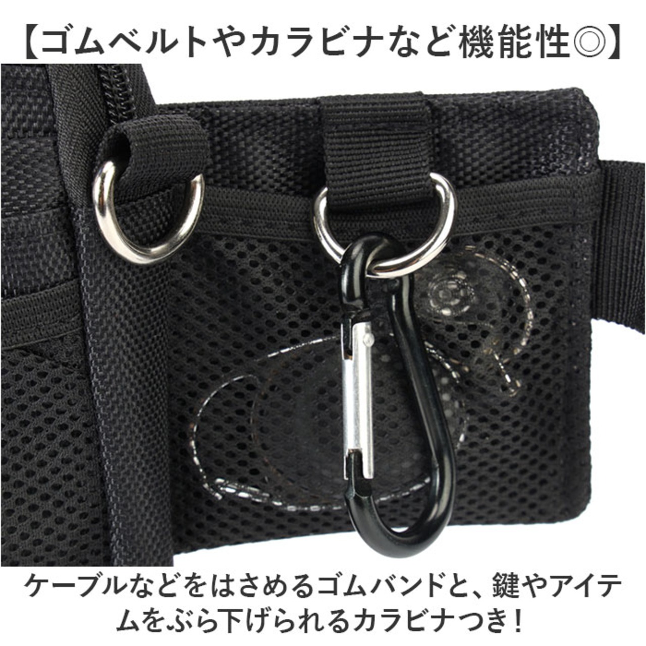 ・ケーブルなどをはさめるゴムバンドと、鍵やアイテムをぶら下げられるカラビナつき!