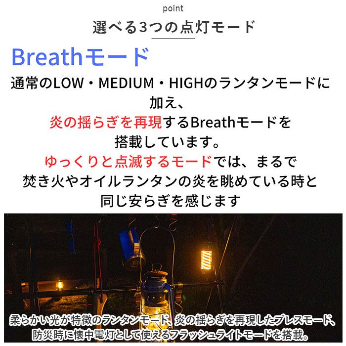 ・柔らかい光が特徴のランタンモード、炎の揺らぎを再現したブレスモード、防災時に懐中電灯として使えるフラッシュライトモードを搭載。